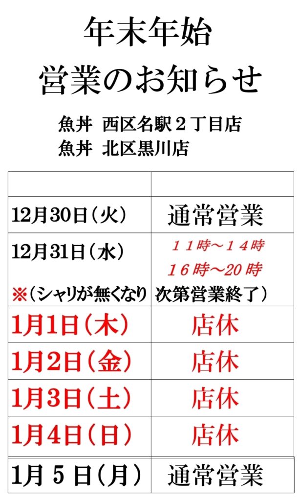 魚丼 北区黒川店 2月15.16日連休とさせていただきます。